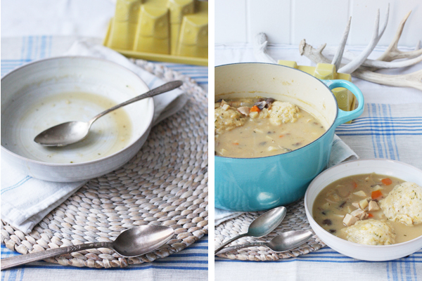 In a large pot,on medium heat, melt butter and add carrots, celery root, garlic, thyme sprigs and bay. Cook 5 minutes, until onion is glossy and carrots are soft. Add flour and stir to coat. About 1 minute. Turn heat to high and add stock, chicken, mushrooms and peas. Bring to a boil, reduce heat and simmer. Drop dumpling batter in by the spoonful. There will be about 6 dumplings. They will expand a lot when cooking so space them out as much as you can. Cover and simmer 15 minutes. (No peeking at the dumplings while they're cooking, opening the lid of the pot lets steam escape and your dumplings need that steam to cook.) Test dumplings for doneness with a toothpick, if not done, cover and simmer 5 minutes more.